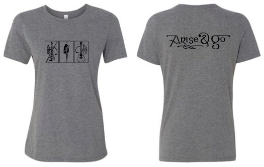 Our women’s cut gray t-shirts feature original artwork by Laura Roddy with fiddle, pipes, and guitar on the front, and the A&G logo on the back.